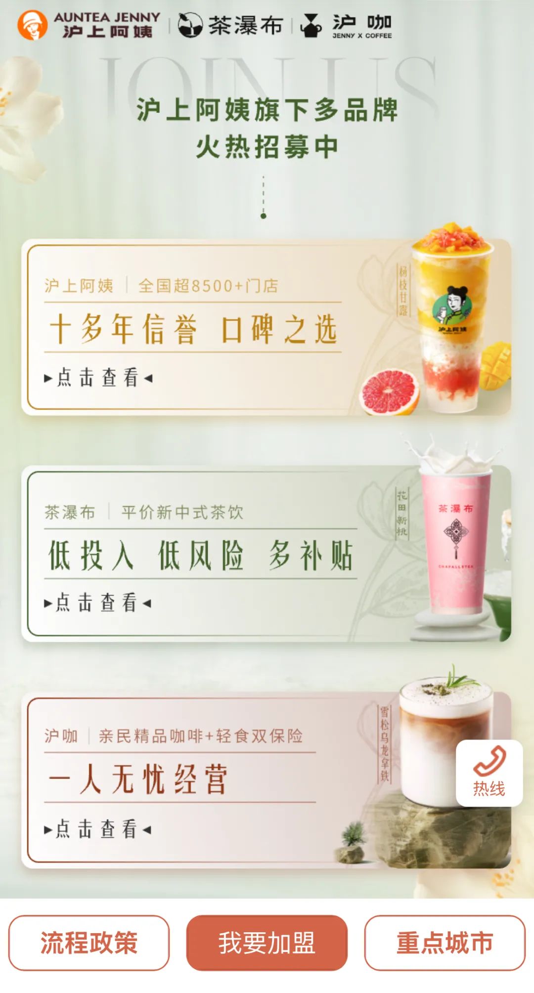 查阅沪上阿姨合伙人小程序,沪上阿姨旗下多品牌都在招募当中